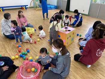 未就園児の年齢別交流プログラムです。年齢の近い子ども同士が集まって親子で一緒に遊びます。毎月テーマを決めて運動遊び、製作、感覚・感触遊びなどをポートの広いホールで行います。色々な体験ができて仲間づくりにもおすすめです。