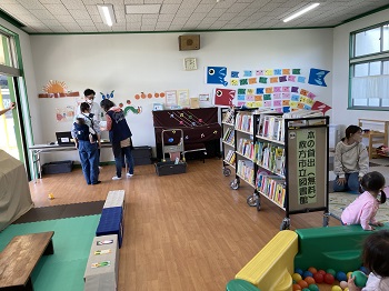 広場のスタッフが地域へ出向くプログラムです。季節に合わせたテーマで製作などをして遊びます。ふれあい遊びや絵本の読み聞かせもあります。場所:牧野生涯学習市民センター、楠葉生涯学習市民センター、地域の公園など